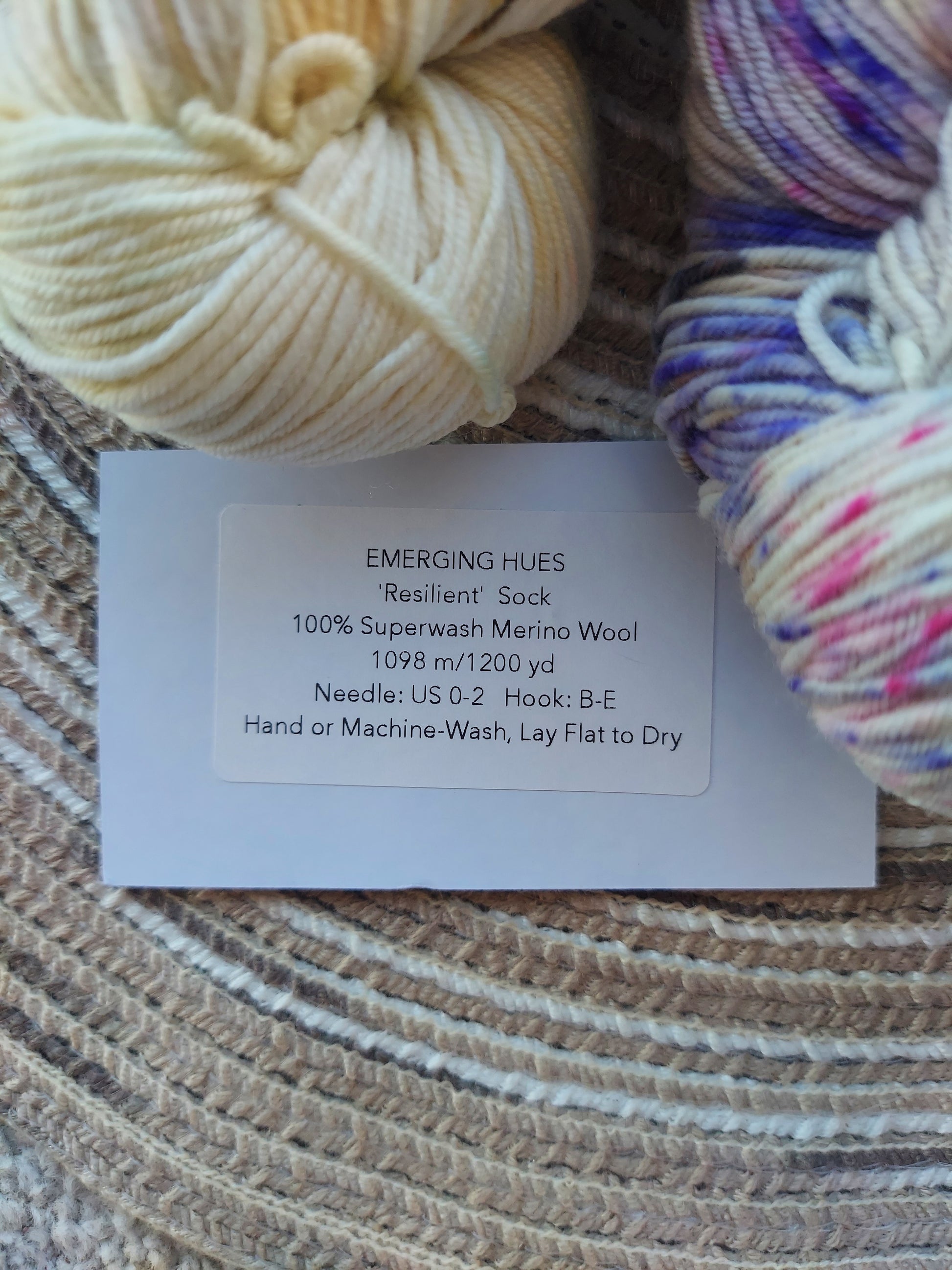 The Resilient Sock version of this yarn is a 4-ply fingering weight, made from superwash Merino wool, which is soft and machine-washable.