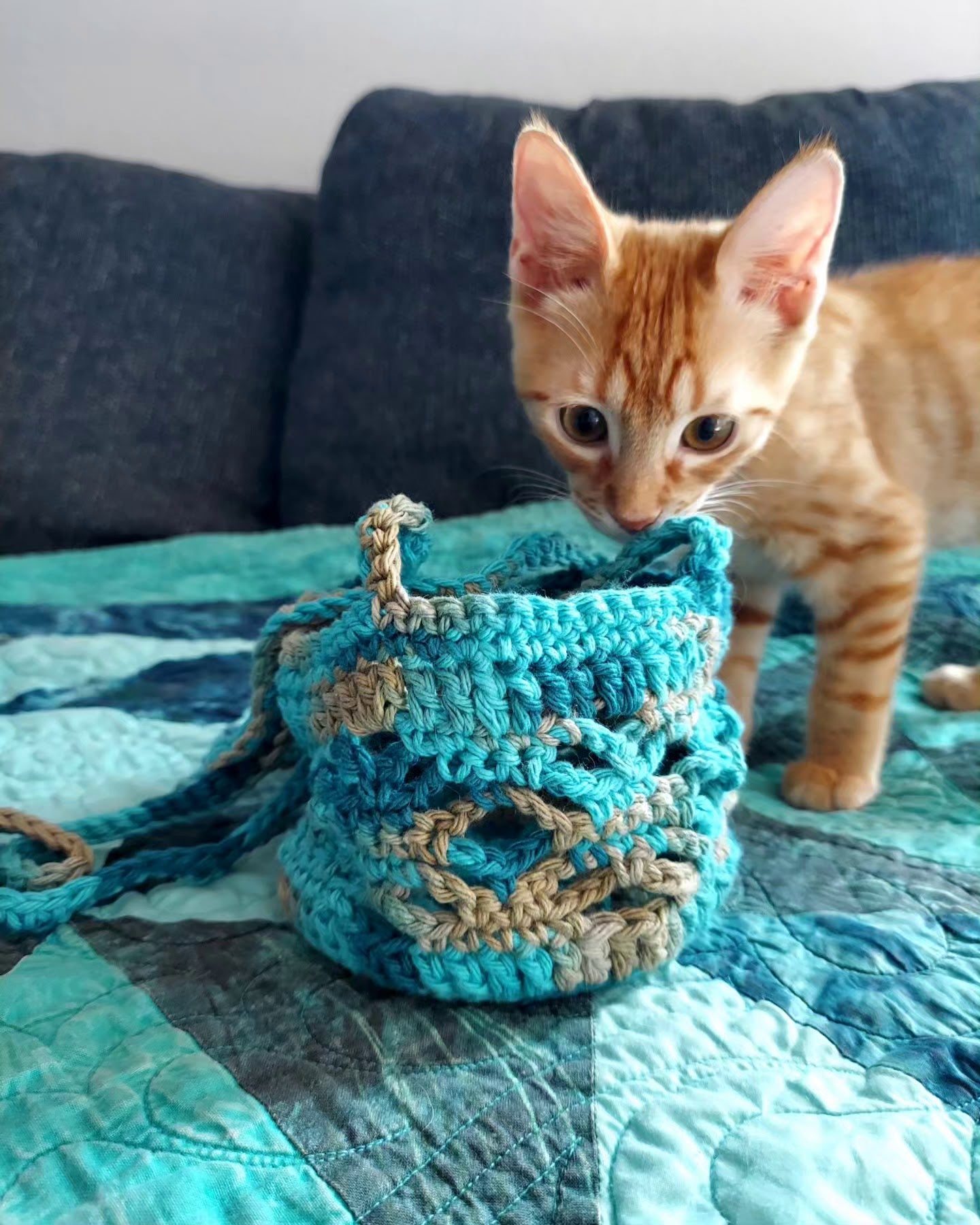 - Material: Sugar'n Cream 100% cotton yarn in variegated blues and natural beige