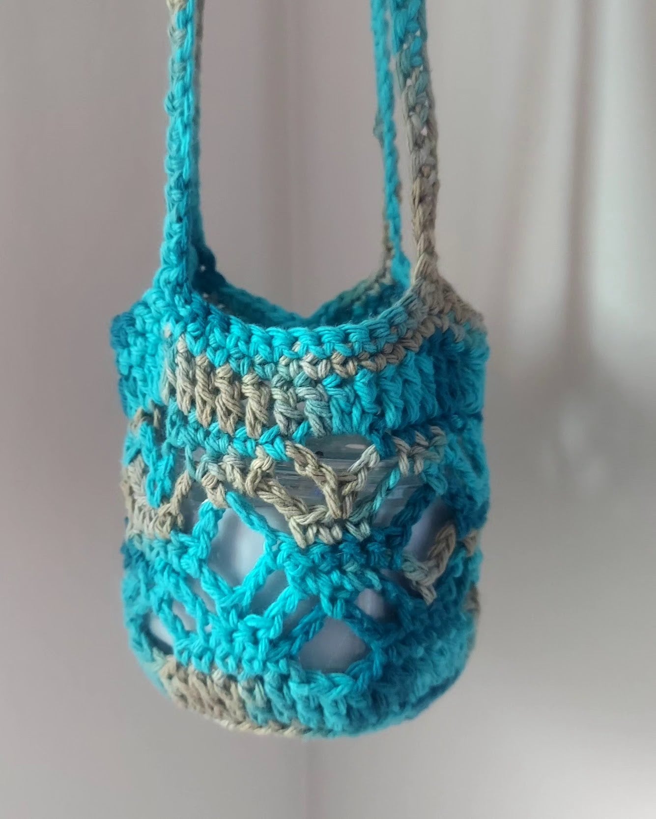 Add a touch of artisanal charm to your home with this beautiful, made-to-order Sonoran crochet plant hanger. Crafted with love and care, this hanger features *Sugar'n Cream's 100% cotton yarn in vibrant variegated colors of blues and beige. The intricate openwork pattern creates a series of diamond-shaped spaces, allowing the color of your pot to peek through, adding a unique depth of color.