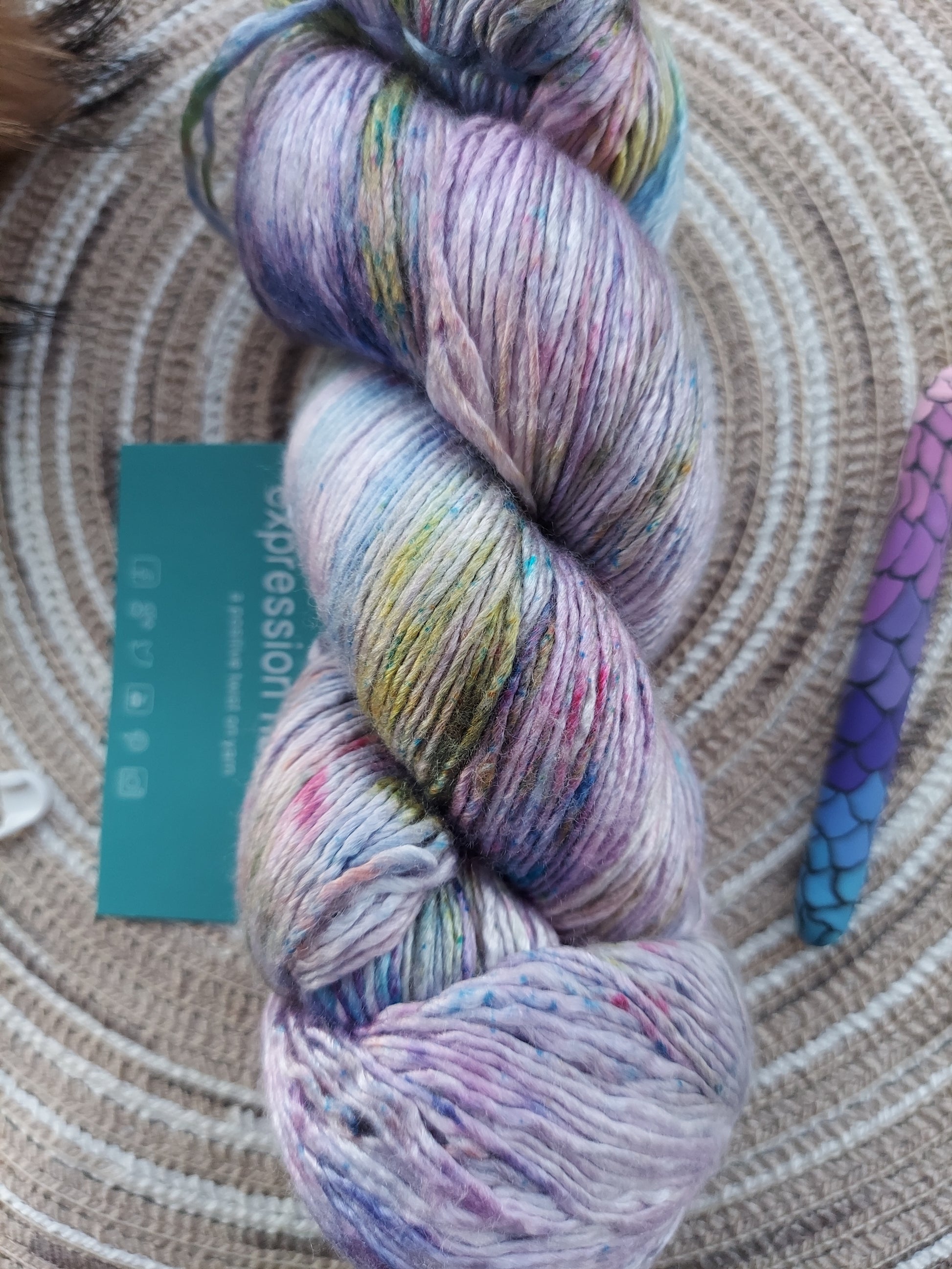 Note: Each skein is a hand-created, unique work of art, and no two skeins will be identical, even within the same dye lot. If working with more than one skein in a project, it is best to alternate skeins every other row.